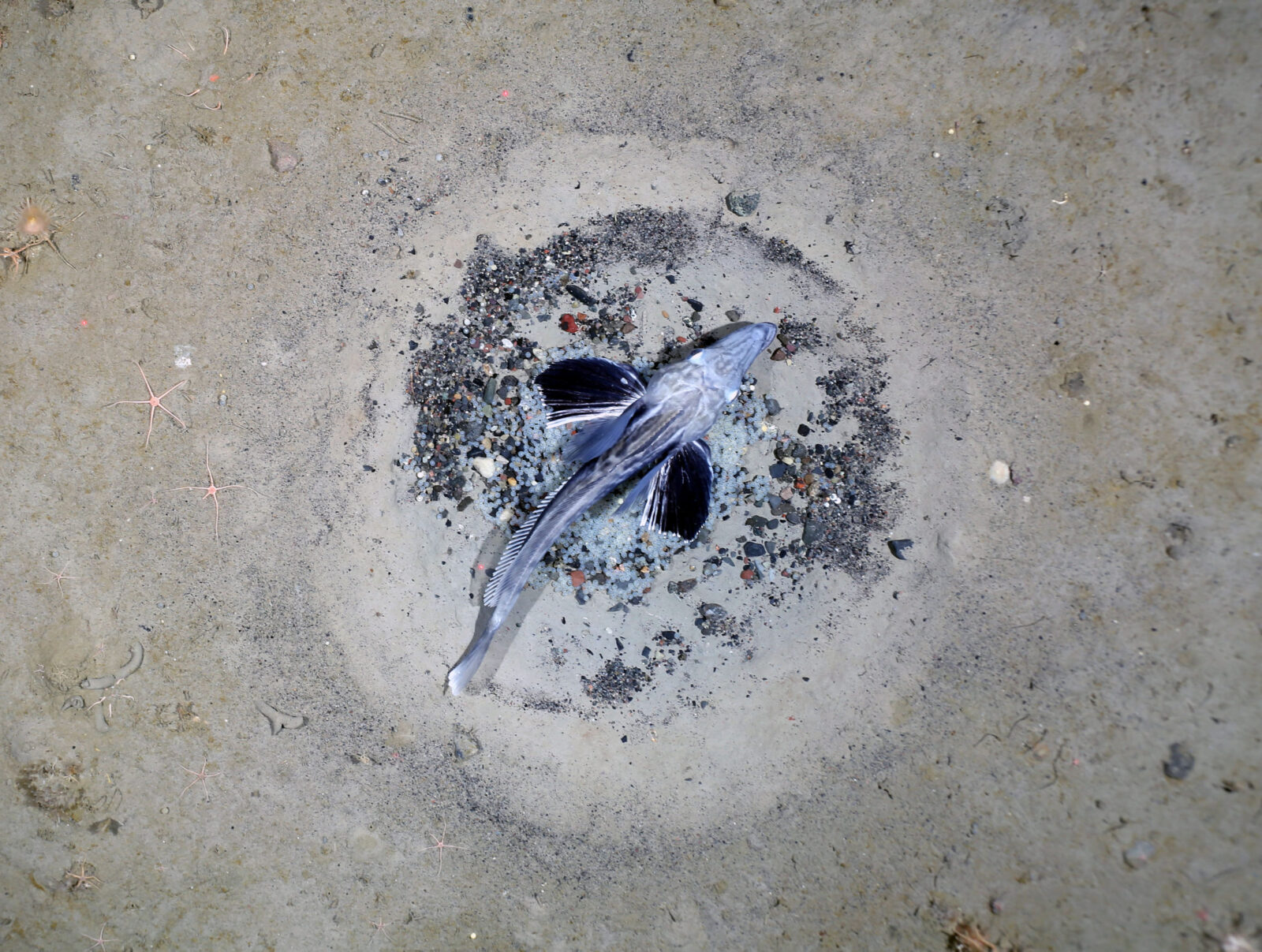 The breeding colony revealed that Neopagetopsis ionah are more than just physiological oddities — they are also careful architects of the seafloor. Each nest is about 75 cm wide, lined with pebbles, and guarded by a parent fish. The density is staggering: in some places, researchers counted a nest every three square meters.